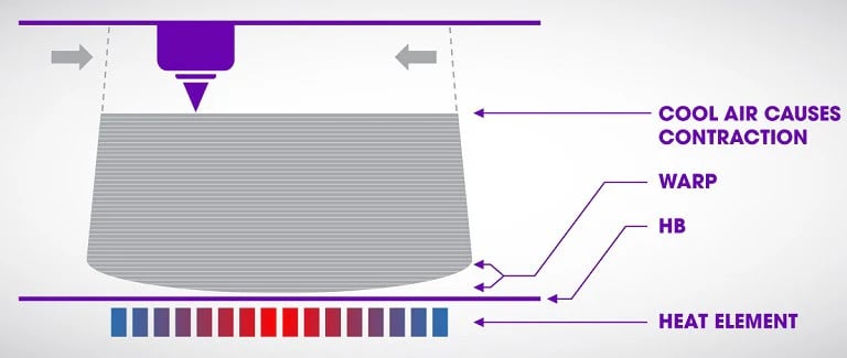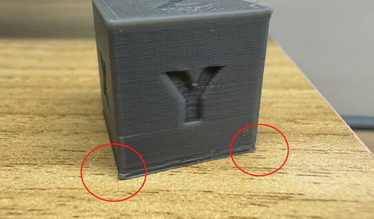 Warping (angoli sollevati)Pezzo che si deformaRaffreddamento rapido, piatto freddo✔ Aumenta temperatura piatto