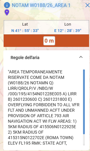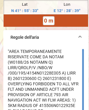 Testo: "AREA TEMPORANEAMENTE RISERVATE COME DA NOTAM (W0188/26 NOTAMN Q) LIRR/QROLP/V /NBO/W /000/195/4154N01228E005 A) LIRR B) 2601230600 C) 2601231800 E) OVERFLYING FORBIDDEN TO ALL VFR FLT AND UNMANNED ACFT UNDER PROVISION OF ARTICLE 793 AIR NAVIGATION ACT WI FLW AREAS: 1) 5KM RADIUS OF 415506N0122925E 2) 5KM RADIUS OF 415315N0122702E (ROMA TOWN) ELEV FL195 RMK: STATE ACFT, EMERG AND HOSP FLT NOT AFFECTED F) GND G) FL195 "Nel punto E) OVERFLYING FORBIDDEN TO ALL VFR FLT AND UNMANNED ACFT