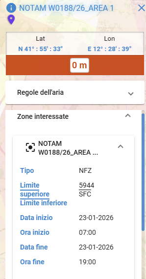 Per visualizzare le informazioni del notam, basta cliccare su un punto al suo interno e poi premere il bottone con la "I" sulla interfaccia. Si aprirà sulla destra una finestra che riporterà le coordinate del punto selezionato e le due sezioni "Regole dell'aria" con il testo ufficiale del NOTAM e la sezione "Zone Interessate" dove ci sarà l'interpretazione con date, orari italiani e quota.
