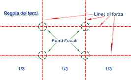 Le linee di questa griglia creano quattro punti di intersezione. La Regola dei Terzi suggerisce di posizionare il soggetto principale o gli elementi di interesse lungo queste linee o, ancora meglio, in corrispondenza dei punti di intersezione.